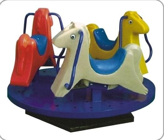 Blue merry-go-round with horse seats, spinning carousel for group fun, classic playground favorite.