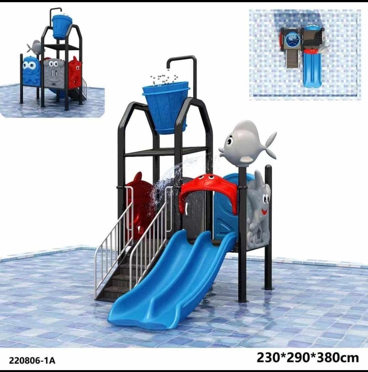 Single blue wave slide playground decorated with palm tree accents, climbing ladder, platform, and tropical theme elements to evoke a beach adventure feel, encouraging physical activity and pretend play.