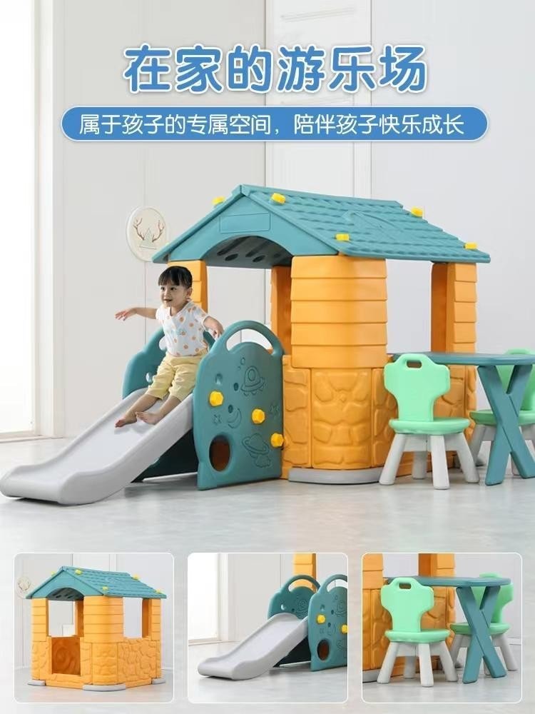 Small house with table and slide, integrated picnic table and slide for social play and snacks in a house setting.