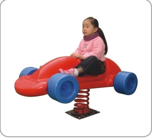 Red car spring rocker with child, vehicle-themed for pretend driving, fun and engaging for little ones.