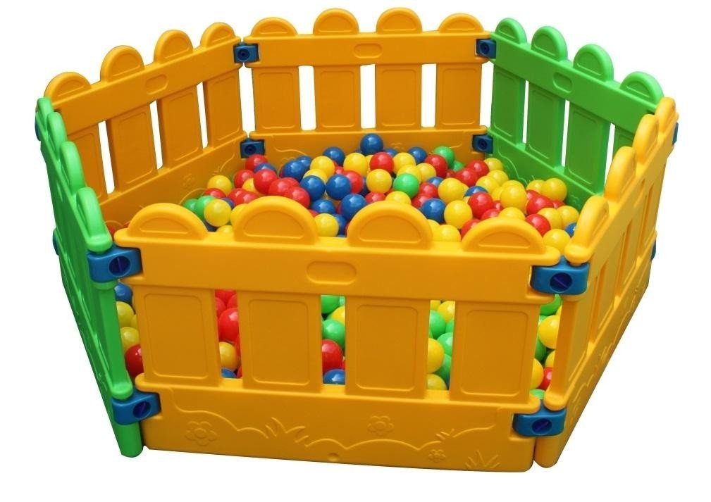 Yellow ball pit with green fence, spacious pit for ball play, promoting sensory and motor skills.