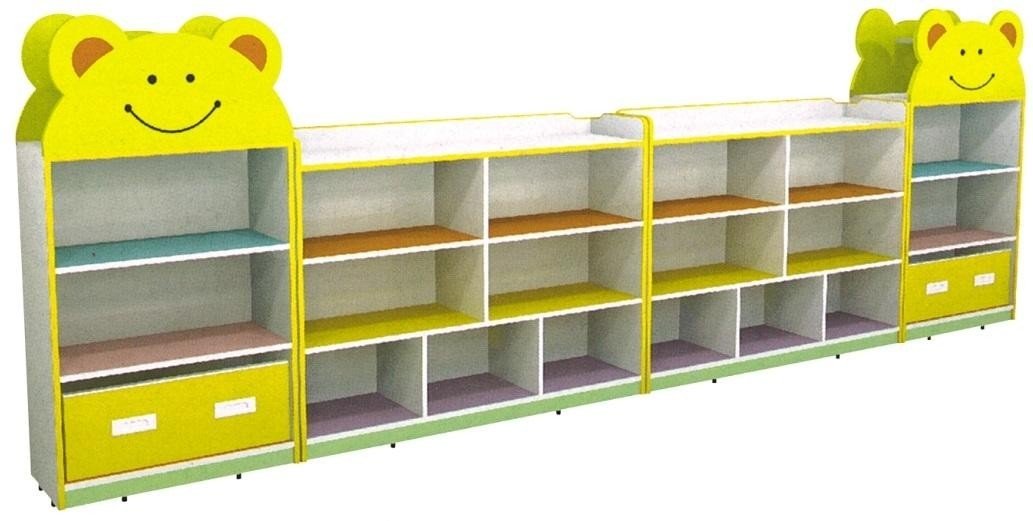 Happy face accents on yellow shelf for cheerful storage solutions in playrooms.